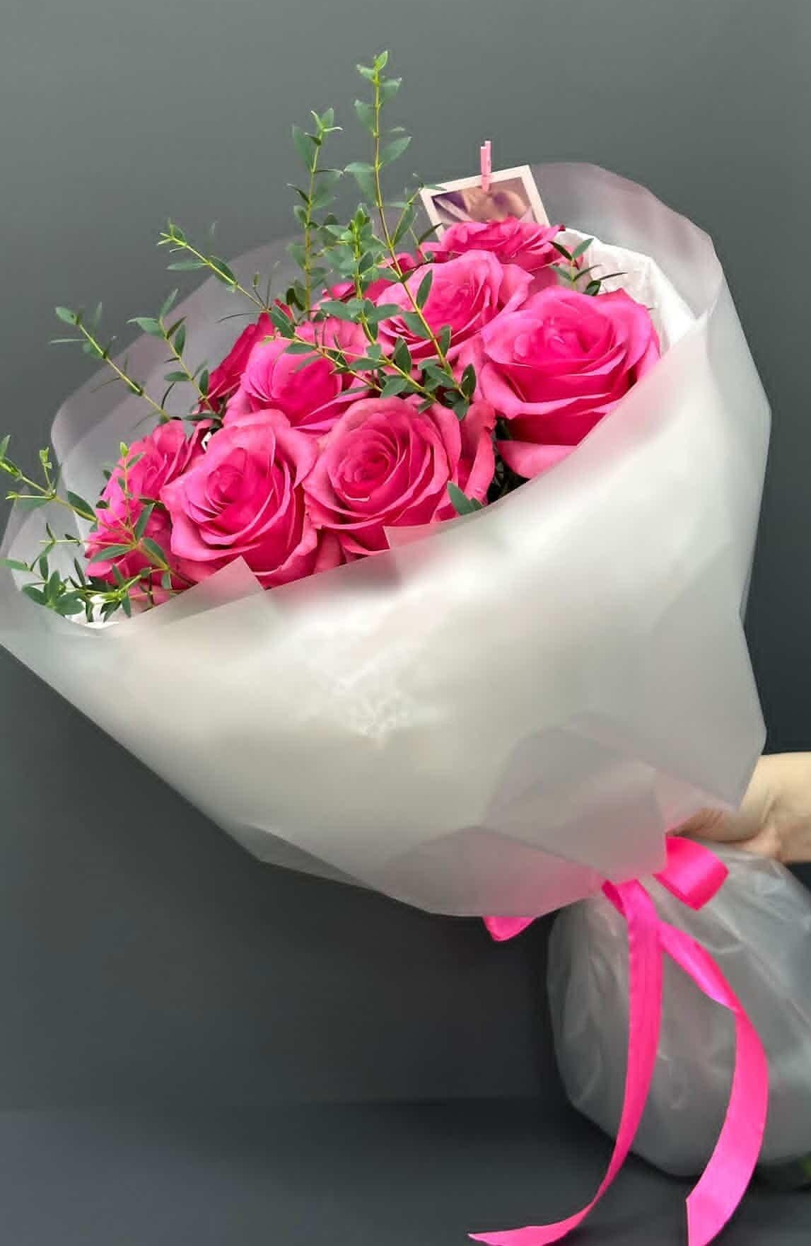 11 роз Лола с зеленью в упаковке