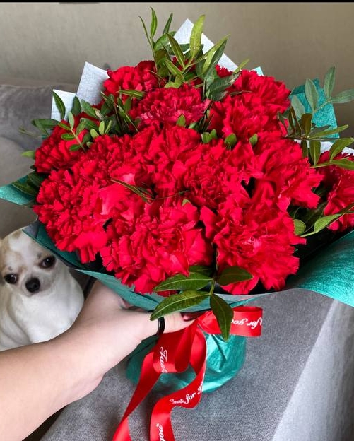 21 красная гвоздика с эвкалиптом в темно-зеленой матовой упаковке