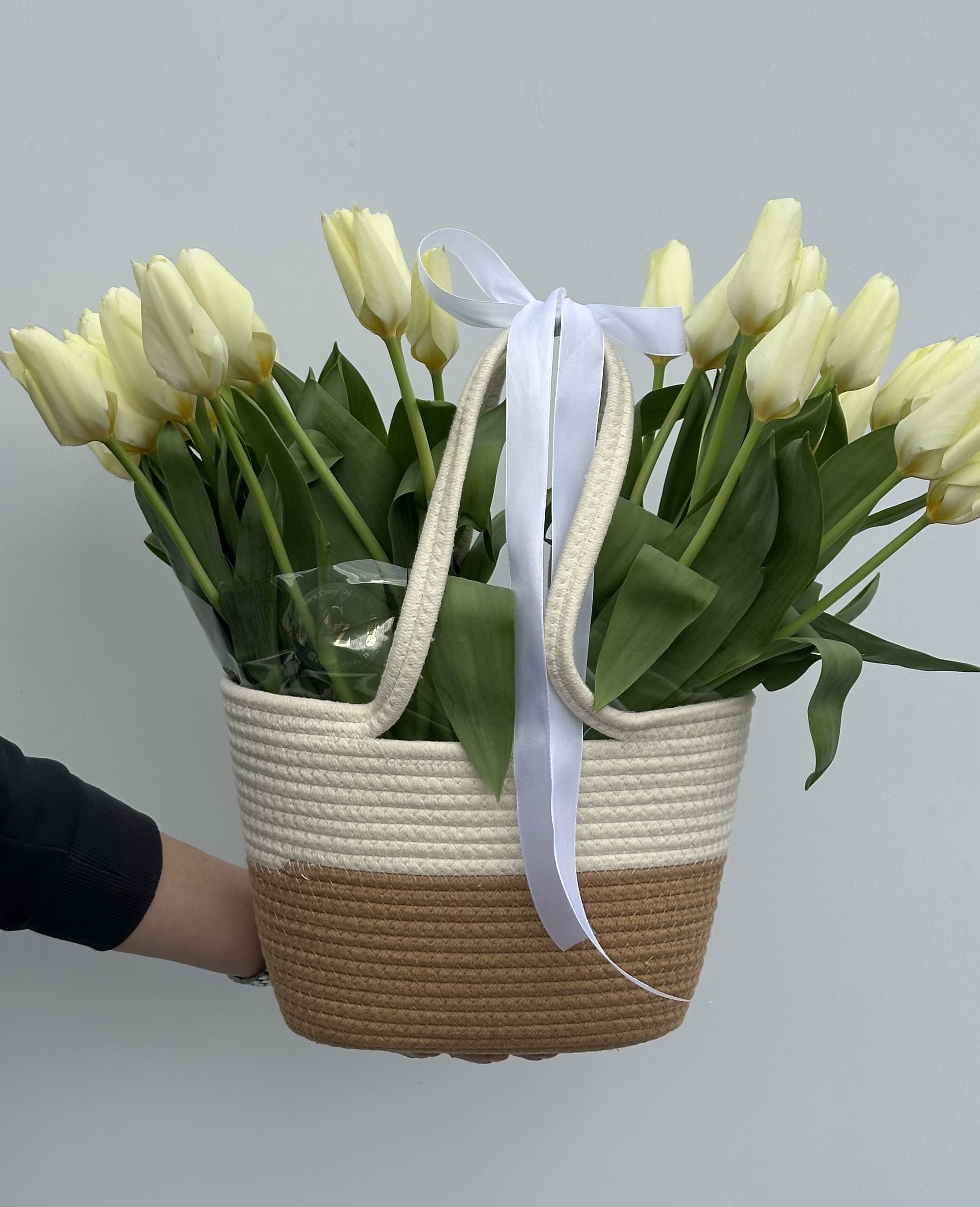 Джутовая корзина с тюльпанами (25 шт) микс сливочных и белых