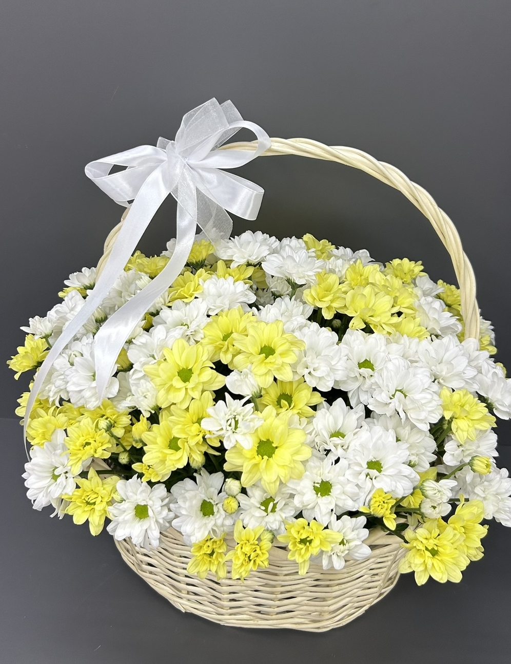 Плетеная корзинка среднего размера с 15 ветками белых и желтых хризантем Бакарди надолго поднимет настроение!