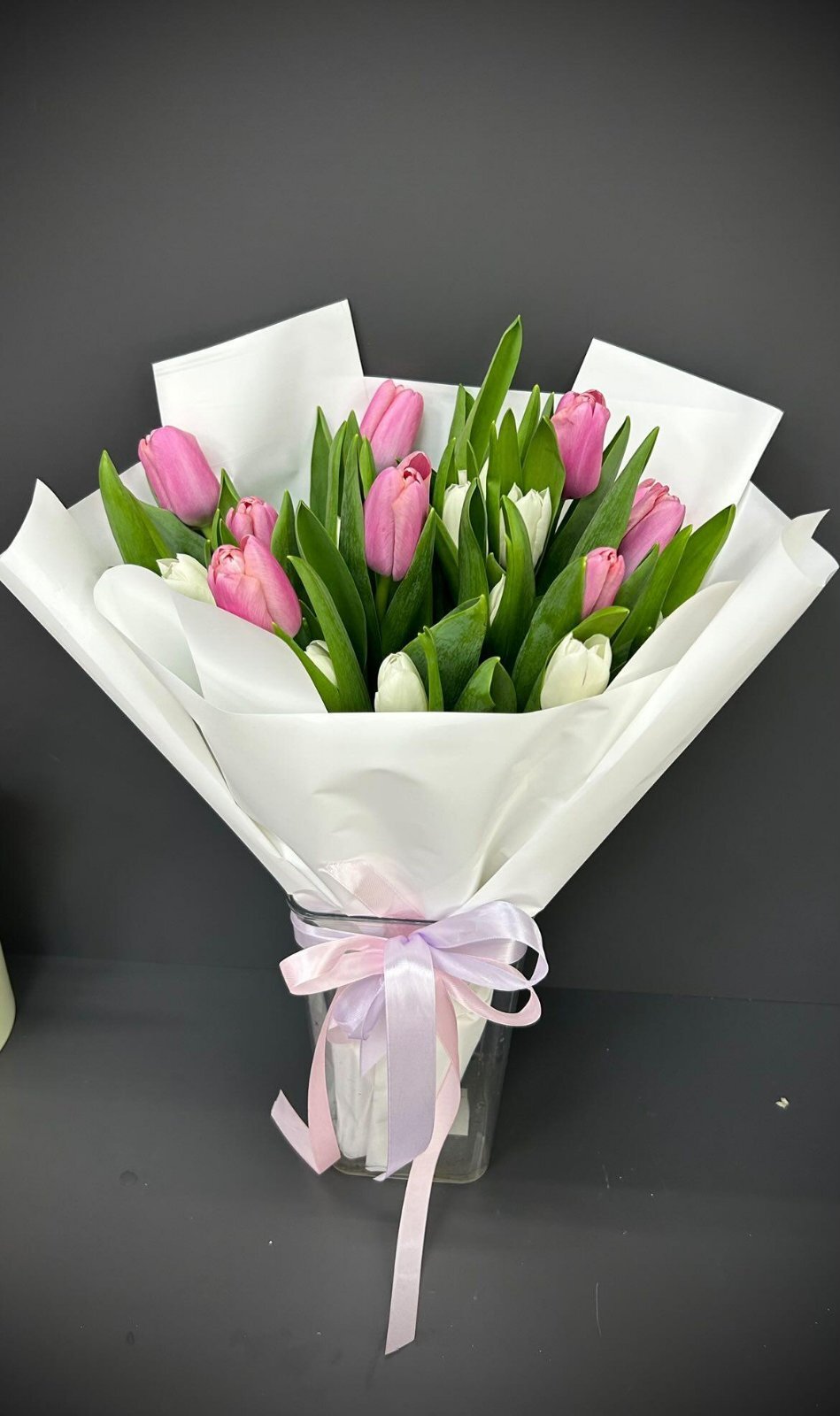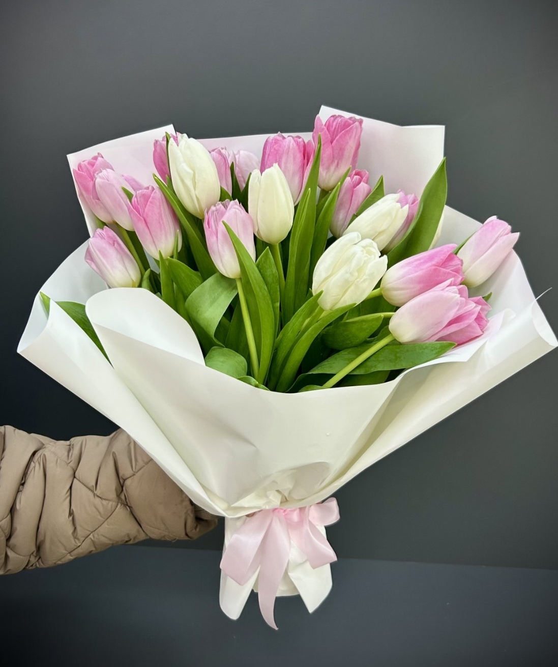 25 тюльпанов в белых и  розовых оттенков. Оттенки цветов и упаковки могут отличатся с учетом пожеланий клиента и наличия товара.